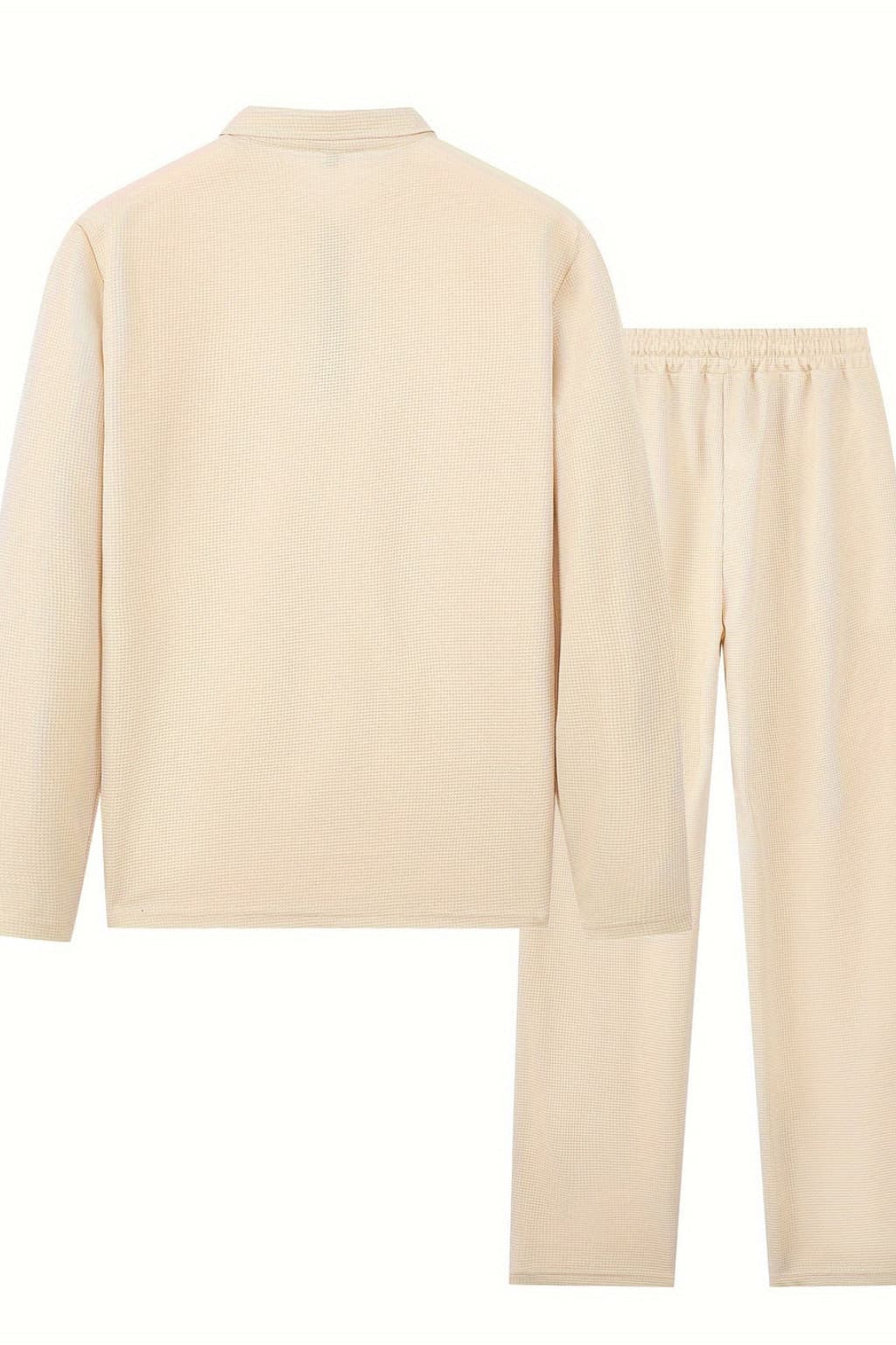 This Men's Beige 2-Piece Knit Set includes a long-sleeve pullover and drawstring trousers, made from a smooth, lightweight knit fabric. The relaxed fit and neutral beige tone suit various casual settings or home wear, offering a coordinated look for men seeking versatile daily attire.- Relaxed Fit: Loose, straight-leg trousers and pullover suit multiple body types.