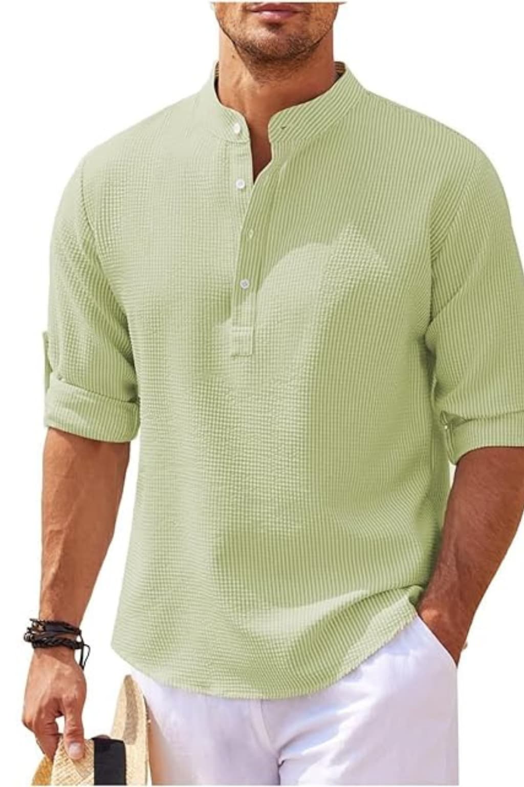 Men’s Linen Blend Shirt Long Sleeve Band Collar Casual