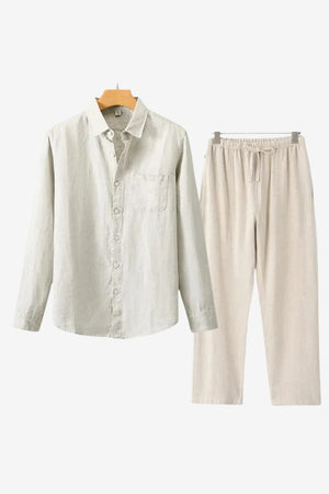 This men's shirt and trousers set features a minimal structure designed for daily wear in warmer conditions. The surface has a neutral tone and smooth texture, presenting a simple appearance. Intended for a loose fit, this coordinated two-piece set supports regular motion without added visual elements.- Relaxed shirt structure: Long-sleeve button-up with a loose design to support airflow and allow space across the shoulders and torso.