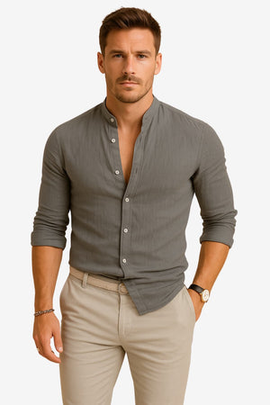 Structured Long Sleeve Shirt with Mandarin Collar and Defined Fit