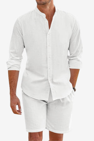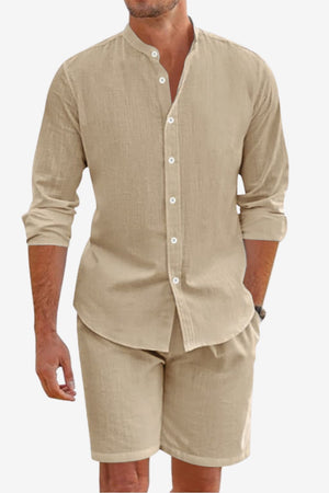 This men’s two-piece outfit includes a long-sleeve button-up shirt with a mandarin collar and above-knee shorts. Both pieces are constructed with a relaxed silhouette and functional features for seasonal use. The shirt offers a clean neckline and sleeve adjustability, while the shorts include a fitted waistband and integrated pockets.- Relaxed fit: Shirt and shorts are shaped with room through the torso and thigh for unrestricted movement.