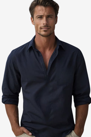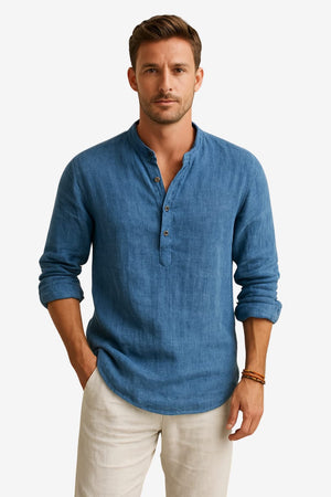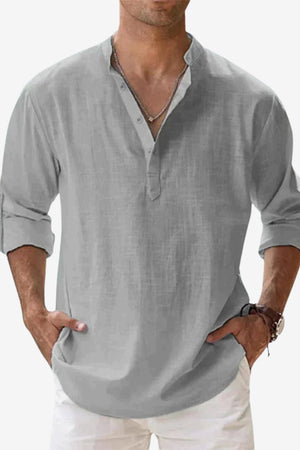 The Men's Long-Sleeve Henley Shirt features a relaxed fit and mandarin collar, designed for everyday use. Its airy fabric and adjustable buttons suit casual outings or warm weather, offering a balanced structure for men seeking a practical garment for various settings.- Relaxed Fit: Loose silhouette with buttons for adjustable wear.