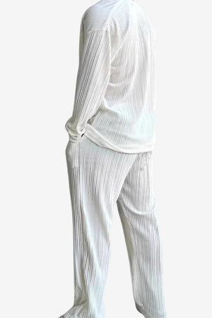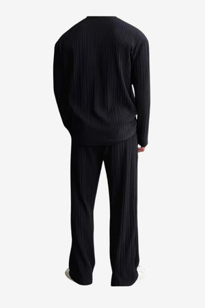 The Men's Pleated Lounge Set includes a long-sleeve shirt and elastic-waist trousers, designed for a minimalist, coordinated look. Its pleated fabric and relaxed fit cater to men seeking versatility for casual outings or lounging, with a focus on functionality and ease of wear.- Adjustable Fit: Elastic waistband and relaxed silhouette suit various body types.