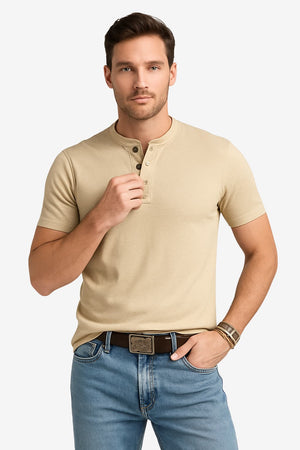 This men's short sleeve Henley T-shirt features a relaxed form with a buttoned neckline, suited for use during spring and summer. Its defined surface texture and structured placket provide a more ordered appearance while maintaining casual characteristics. Designed for those seeking lightweight garments with simple combination options, it balances seasonal wearability with minimal design elements.- Three-button Henley neckline: Includes a structured placket that adds linear detail and supports adjustable neckline positioning.