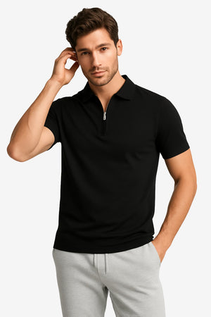 The Men's Short-Sleeve Navy Polo Shirt with Zip Collar features a navy color and a zip-up collar. Its fabric is suitable for casual outings or semi-formal occasions. This polo is designed for men seeking a balance of style and practicality, with a fit that follows the body’s shape and a surface texture suitable for daily wear.- Fit: Shaped to follow the body’s natural lines.