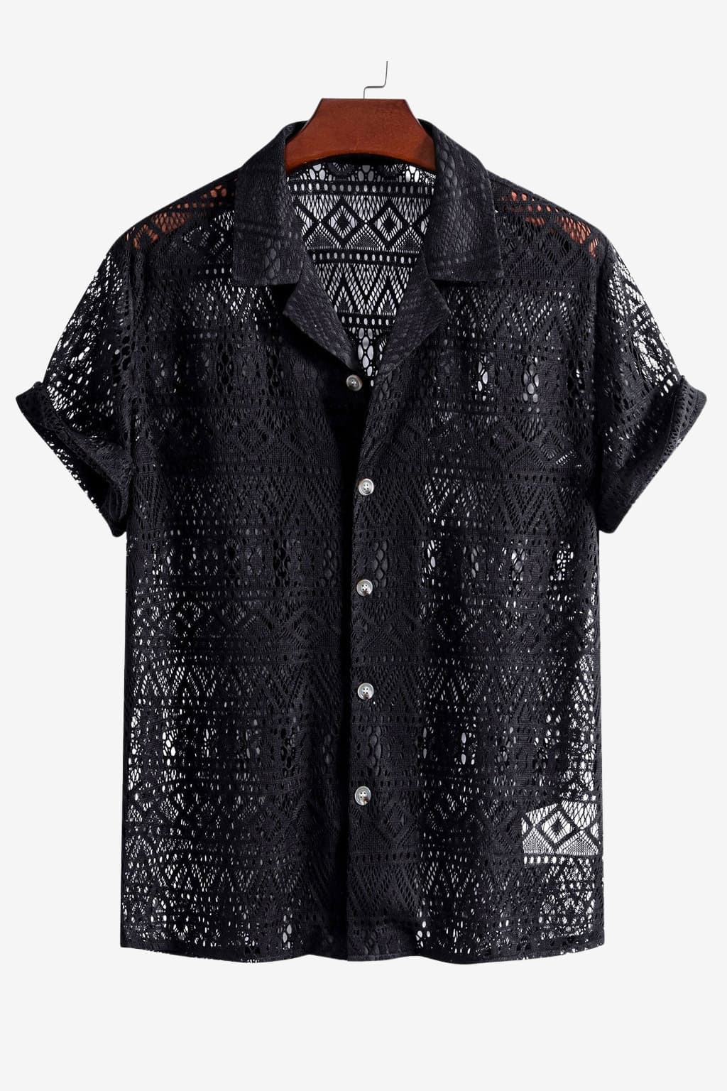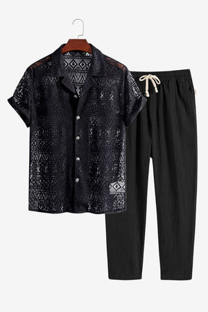 This men's short sleeve shirt and trousers set applies a modern design approach with a combination of structured form and lightweight fabric. The coordinated black set includes a short-sleeve shirt with surface texture and minimal straight-leg trousers, designed with a relaxed outline for regular wear in different conditions. Created for flexibility in styling, the pieces suit those who prefer adaptable wardrobe options.- Patterned short sleeve shirt: Features a textured surface with geometric elements that contribute visual variation.