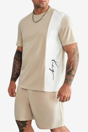 This men’s short-sleeve t-shirt and shorts set provides a matching outfit suitable for warmer conditions. Built with a straight silhouette and textured surface, the set includes a soft crew neck top with a color-block panel and small printed text, along with knee-length shorts shaped for non-restrictive wear. Developed for everyday use across various casual settings.- Short-sleeve t-shirt: Includes a crew neckline and relaxed shape suitable for standard daily wear.