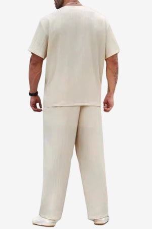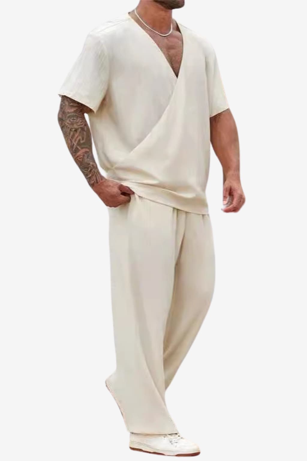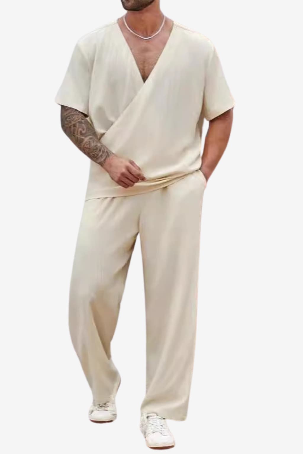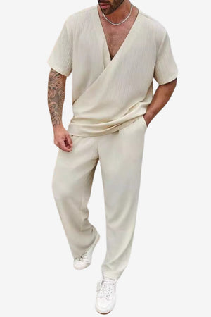 This men's two-piece set includes a short-sleeve V-neck top and full-length pants, featuring a loose-fitting structure and minimal detailing. The design is suited for warm conditions and informal settings, offering consistent surface feel and balanced proportions between upper and lower components.- Overlapping V-neck: The neckline features a wrapped front that creates a clean and defined upper shape.