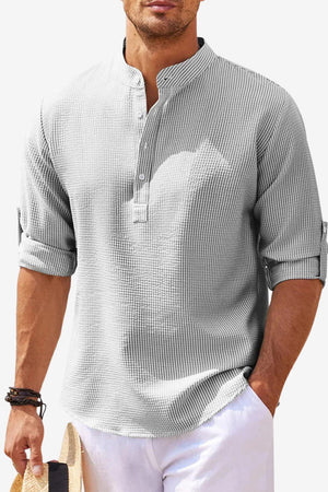 - Mandarin collar with partial placketProvides a simplified neckline alternative, aligning with the shirt’s minimal structure.