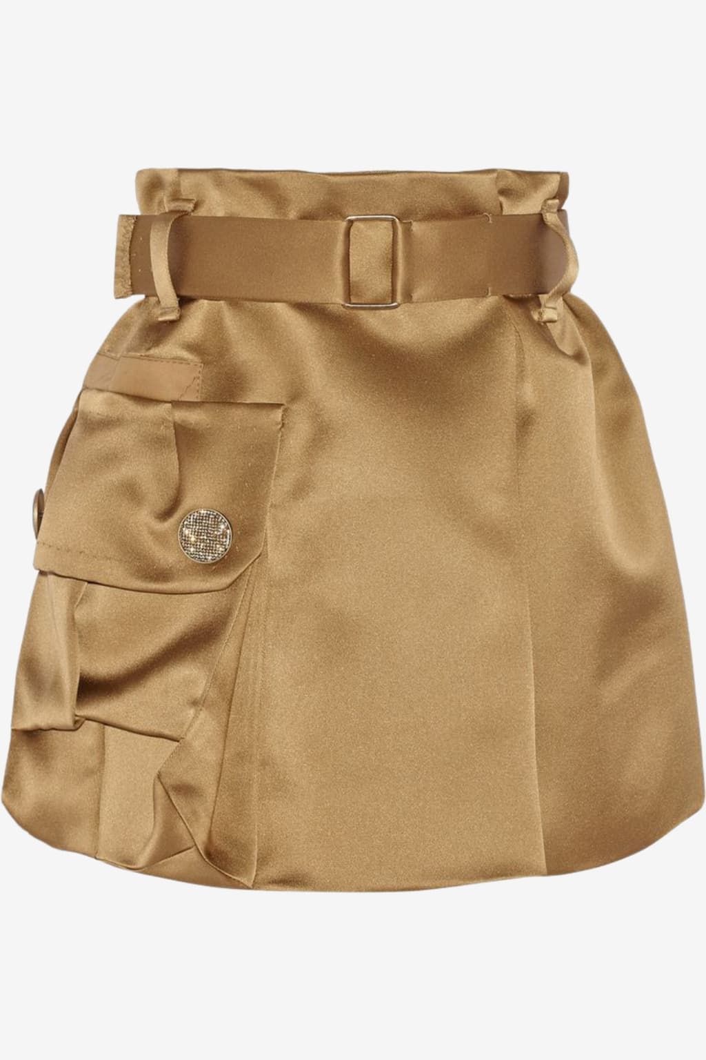 The Women's Asymmetrical Ruched Mini Skirt is a high-waisted, loose-fit bottom with a flared shape. Made from smooth, shiny fabric, it offers a structured silhouette. Suitable for casual outings, this skirt includes a belt and pockets for added functionality. Its 15-inch length provides a practical option for everyday wear.- Flared Silhouette: Loose fit accommodates various body types comfortably.