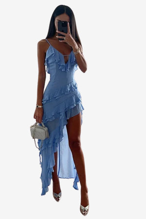 The Women's Asymmetrical Ruffle Mini Dress is a fitted, lightweight garment with a modern silhouette. Its flowing fabric and structured design make it suitable for women attending parties or special occasions. The dress features a unique hemline and thin straps for a distinctive appearance.- Fitted Silhouette: Tailored shape complements various body types.