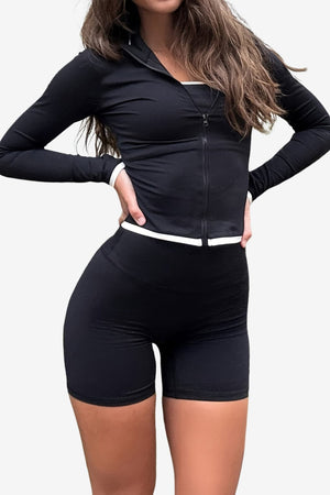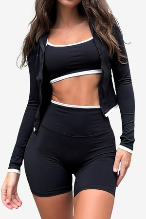 The Women's Black Activewear Set with White Trim is a three-piece outfit, including a sports bra, high-waisted biker shorts, and a zip-up jacket. Its lightweight, stretchy fabric and fitted silhouette make it suitable for women during workouts or casual outings. Designed for functionality, it supports various activities with a coordinated look.- Adjustable Fit: Compression fit with high-waisted design for various body shapes.
