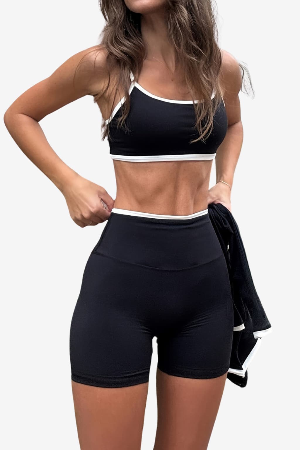 - Biker Shorts Form: High-waisted with white trim along the waistband.