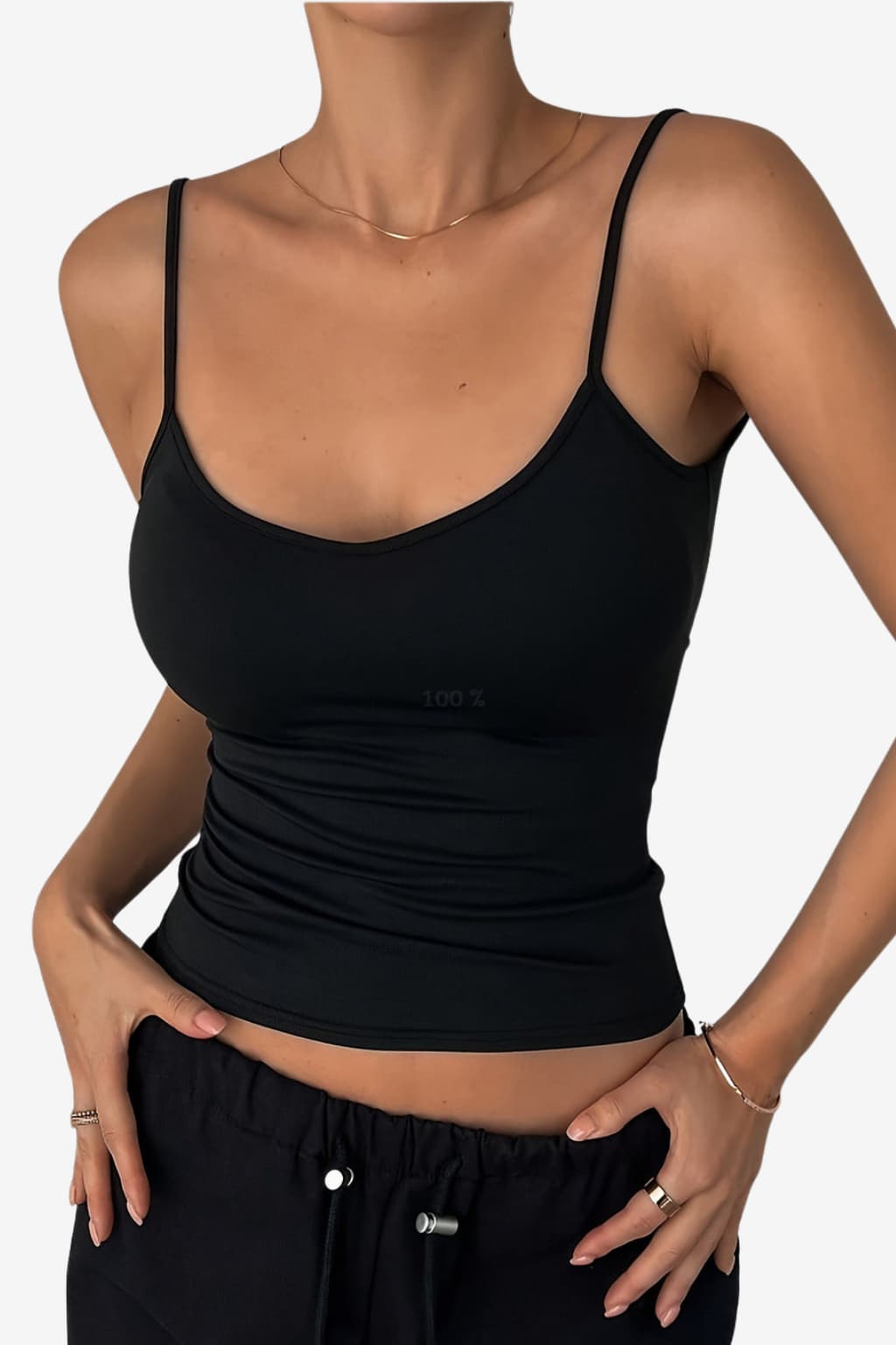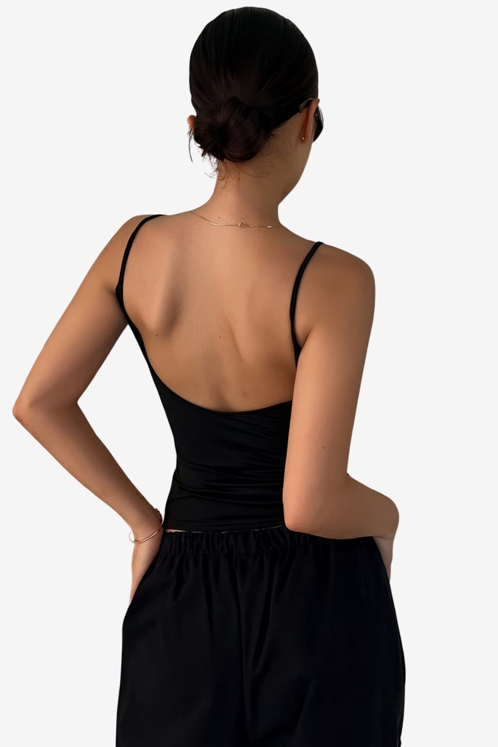 This women's black backless cami top features a sleeveless, shaped cut with thin adjustable straps and a smooth surface texture. Suitable for warmer conditions, the top is designed for individuals seeking a lighter option that works in both informal and casual environments. Its open-back construction adds a visual element to a simple front, while the neutral neckline and soft-feel fabric contribute to its practical use.- Open-back detail: Reveals the upper back with a clean finish that adds variation to the otherwise simple silhouette.