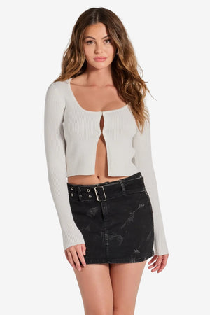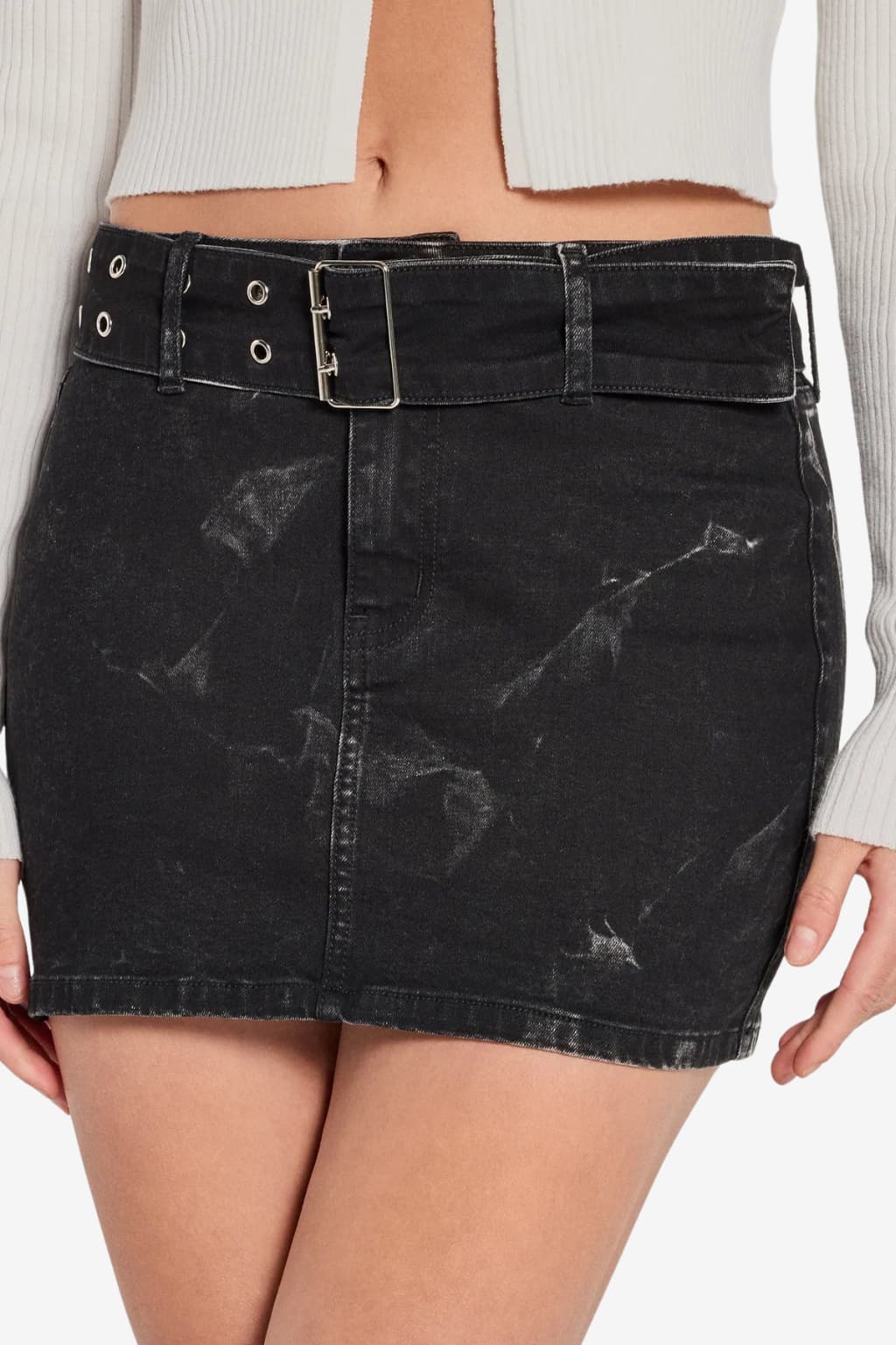 This black woven mini skirt features a straight silhouette with a mid-rise belted waist and mild faded surface detail. Its shortened form and textured structure support versatile use, appropriate for relaxed daywear or more styled combinations. Designed for those seeking a close fit with adjustable waist shaping, it combines defined lines with everyday function.- Mid-rise belted waist: Includes a matching textile belt with a silver-tone buckle, allowing for waist adjustment and structured fit.