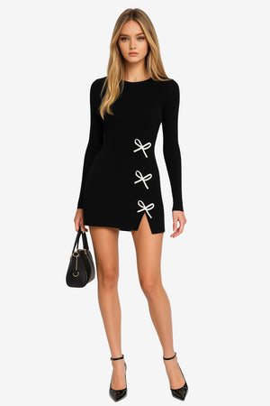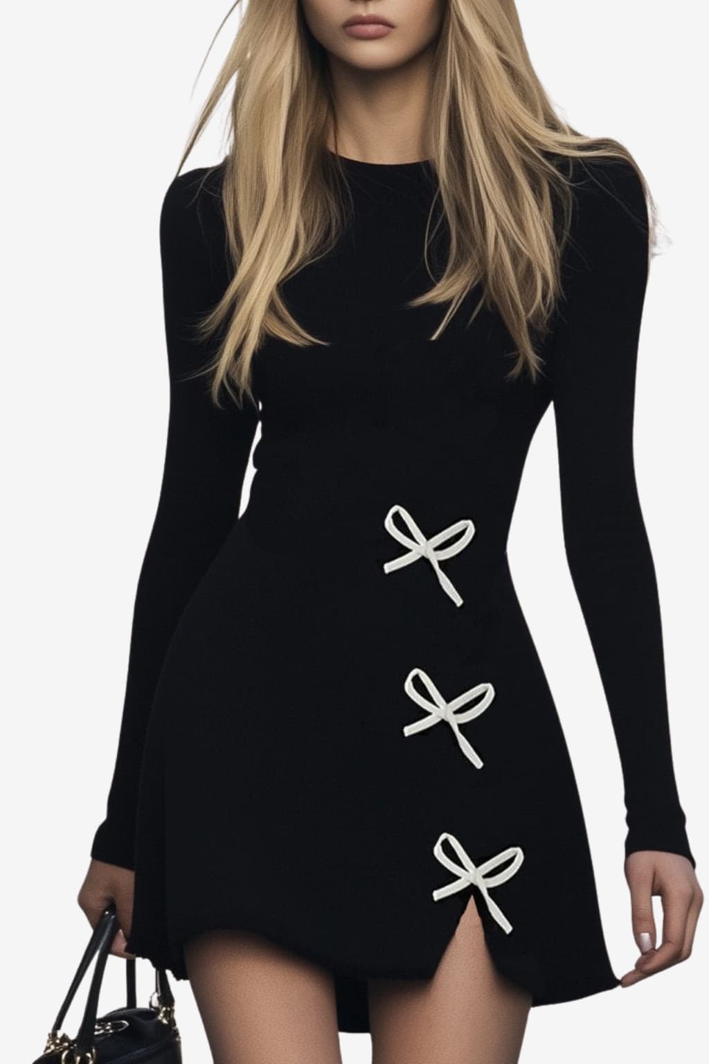 This women’s black mini dress features long sleeves and a slightly flared skirt for a stable outline and measured proportions. With a shaped upper section and minimal decorative features, it is designed for use in both semi-formal gatherings and more relaxed environments. Created for wearers who prefer compact outlines with light design elements, the dress offers styling flexibility without added complexity.- Shaped bodice with flared lower section: Combines a closely contoured upper part with a gradual flare at the skirt to provide defined form through the waist and hem.