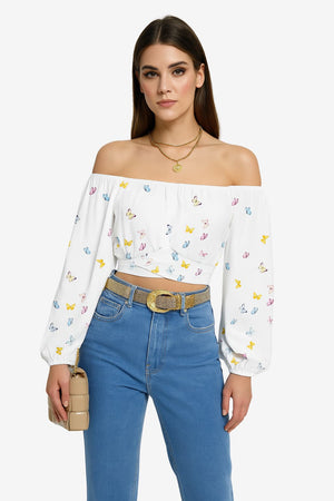 Women’s Boho Off-Shoulder Top Long Sleeve Light Blue