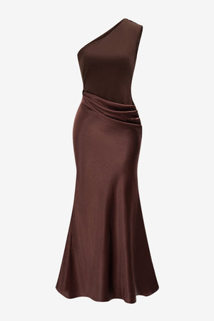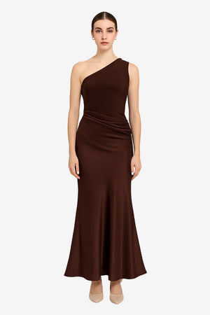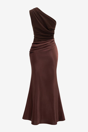 Women's Brown One-Shoulder Fitted Maxi Evening Dress