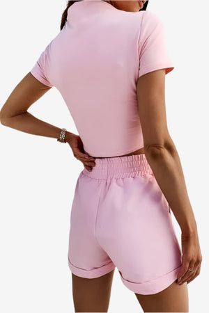 This coordinated set includes a cropped high-neck top and high-waisted shorts designed with a consistent silhouette and soft fabric texture. Developed for warm-weather use, the design maintains a defined structure across both pieces while allowing for a lightweight fit in casual settings.- Cropped high-neck top: Short-sleeve construction with a close fit for a uniform appearance across the upper body.