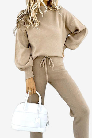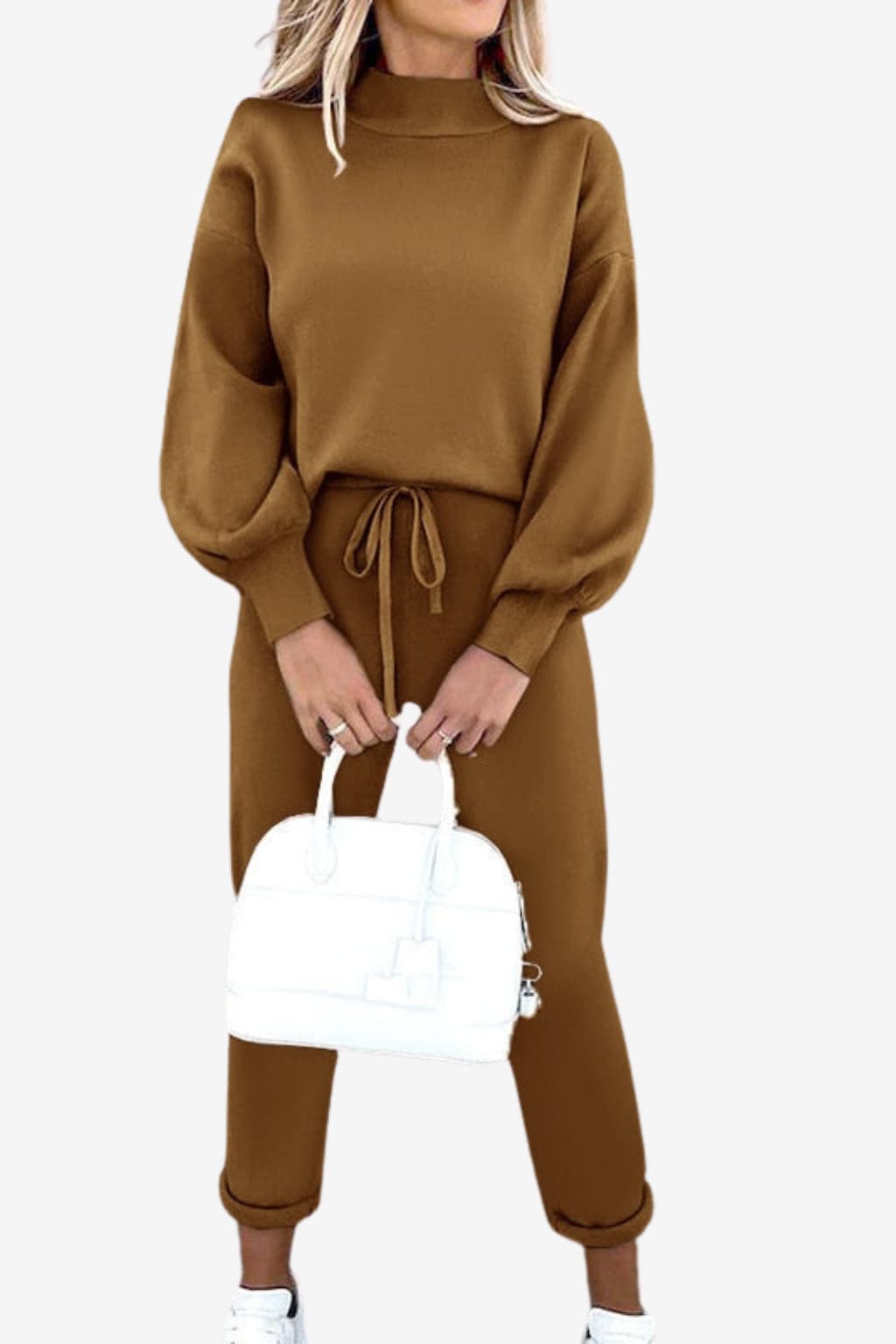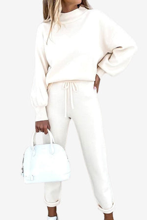 This women’s loungewear set includes a pullover-style top and tapered pants with coordinated design elements. The upper piece features a loose fit and balloon sleeves, while the bottom includes an adjustable waistband and cuffed ankles. Both parts share the same tone and surface finish, supporting a unified appearance for use in informal or home settings.- High-neck pullover top: Relaxed upper with raised neckline and full sleeves gathered at the cuffs.