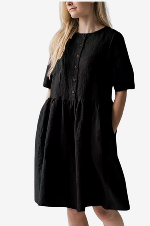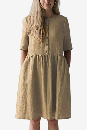 Women's Cotton Linen Midi Dress - Relaxed Fit Short Sleeve with Pockets & Buttons