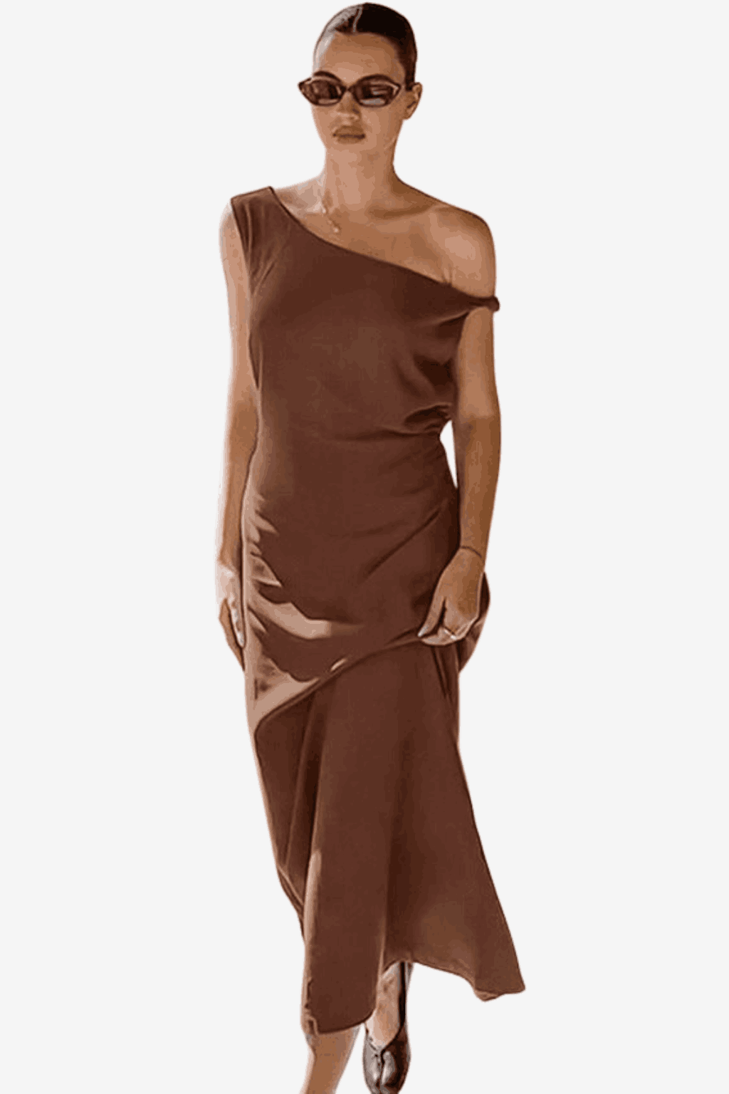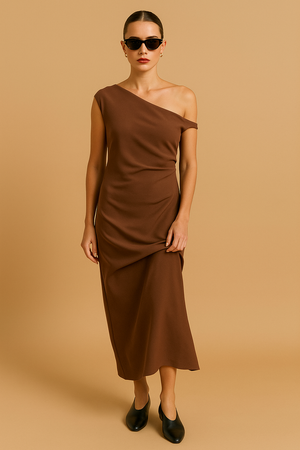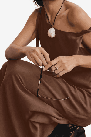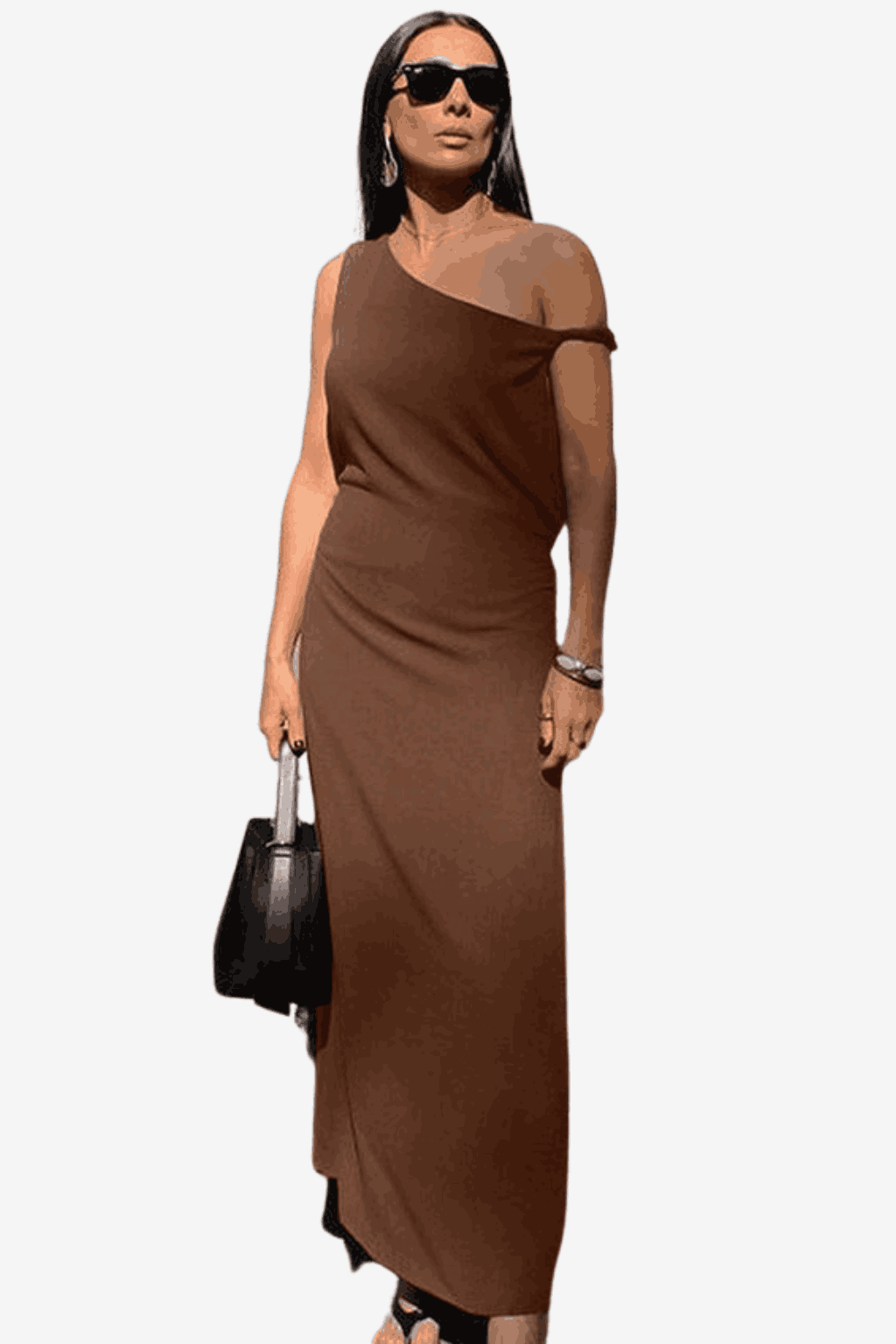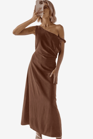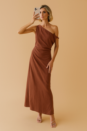 This Women’s Cotton-Linen One-Shoulder Maxi Dress features a modern one-shoulder design and a slim-fit silhouette for a polished and stylish look. Crafted from a breathable cotton-linen blend, this full-length dress is designed to provide comfort and style for various occasions. Available in warm brown or terracotta, it offers a neutral and versatile color palette suitable for formal or casual events.- Asymmetrical One-Shoulder Design: Modern asymmetrical neckline for a refined and contemporary appearance.Minimalist lines for a clean and sophisticated design.