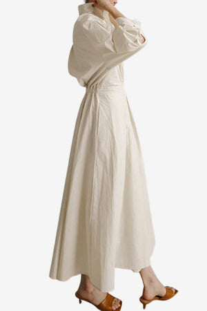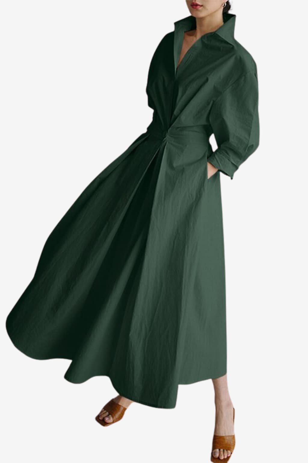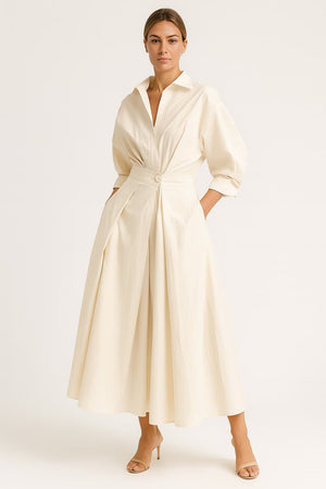 This women's long-sleeve midi shirt dress features a collared V-neck and structured fabric, designed for a minimalist style. Its relaxed fit and midi length suit daily wear, work, or semi-formal occasions.- Relaxed Fit: Designed to fit various body types.