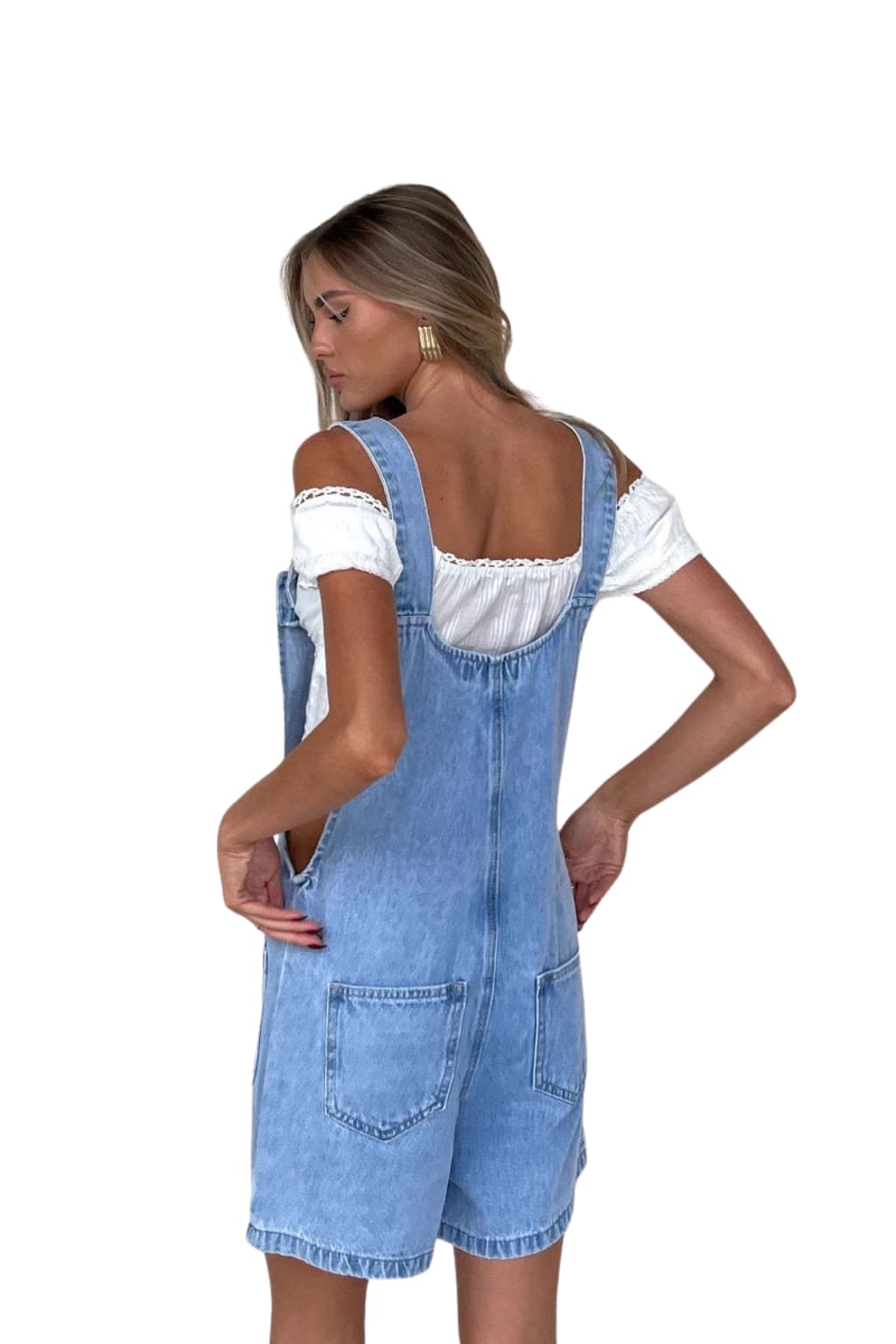 These Women's Bib-Front Dungaree Shorts feature a loose fit, adjustable straps, and a light-washed finish. Designed with practical pockets and a buttoned bib front, they suit casual summer outings for women seeking versatile, easy-to-wear clothing with a relaxed silhouette and functional design.- Adjustable Straps: Wide shoulder straps with closures for a customizable fit.