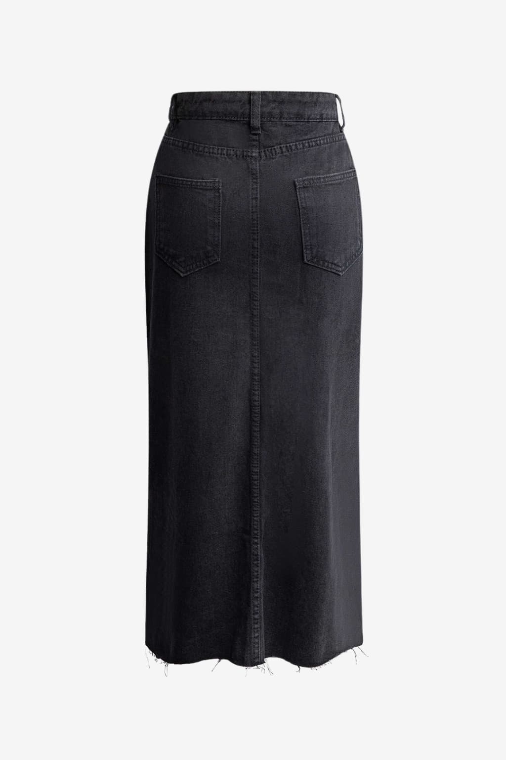 This Women's Wrap Midi Skirt is a fitted, asymmetrical black skirt with a front slit, designed for formal events. Its structured material and high-waisted form provide a defined fit, suitable for women seeking a modern, structured look with ease of movement.- Fitted Silhouette: High-waisted, 25.2" waist, 36.2" hip (size S).