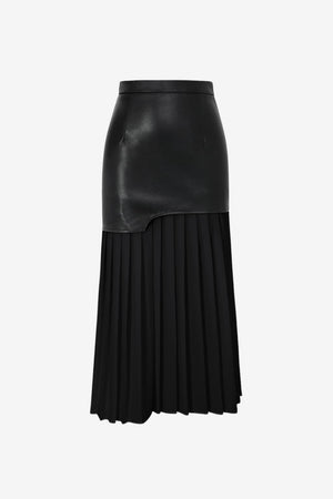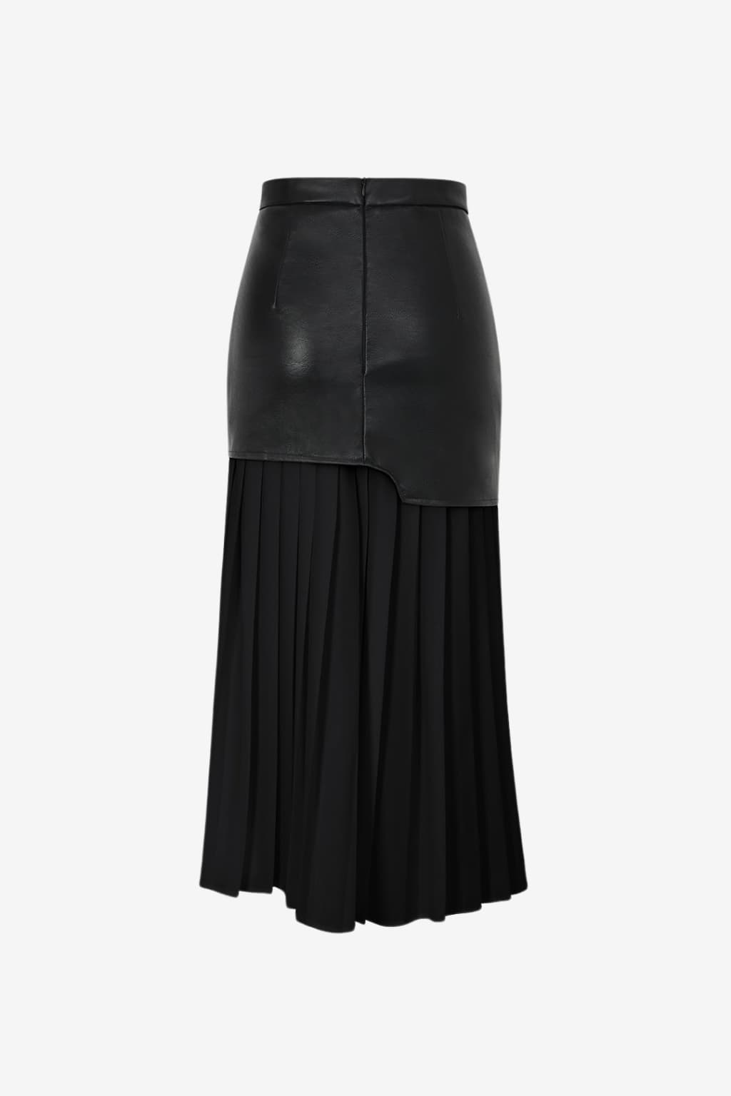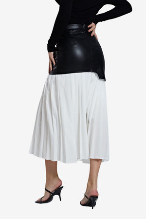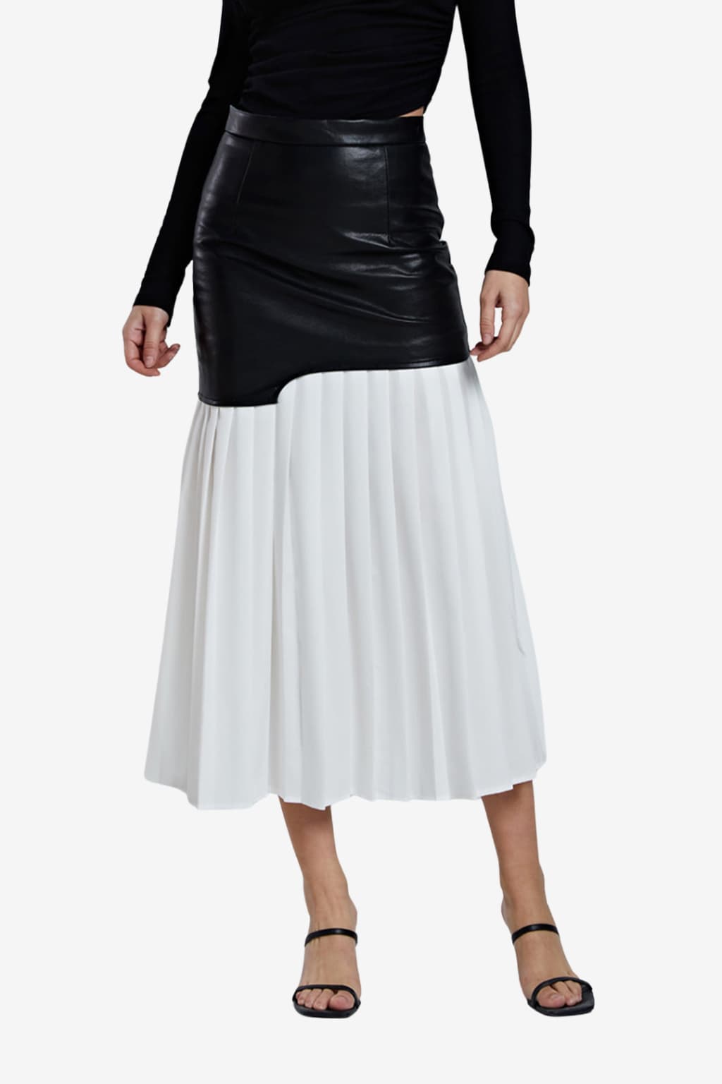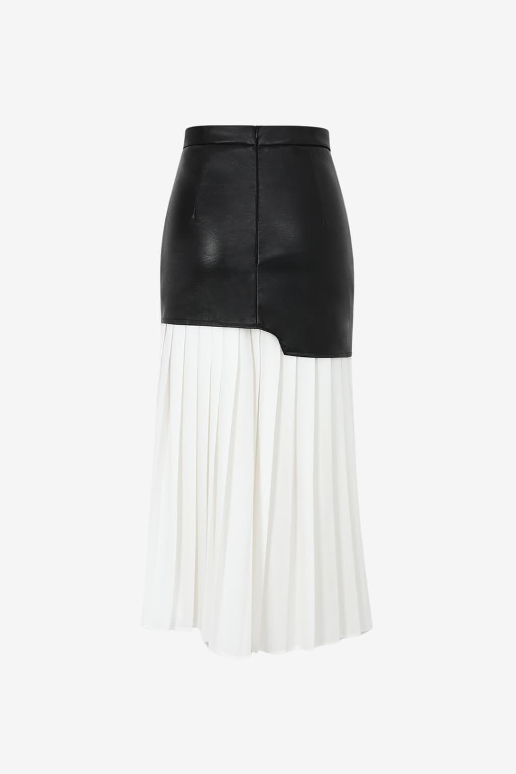 Women's Faux Leather Pleated Midi Skirt Black White High Waist