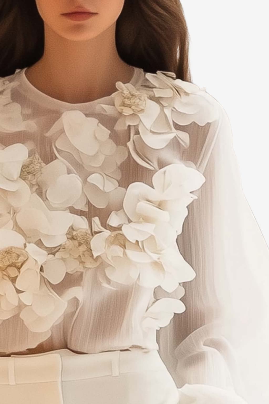 This women's long-sleeve chiffon top features floral appliqués and a round neckline with tie detailing. Its lightweight, sheer fabric and regular fit make it suitable for various occasions.- Regular Fit: Provides a non-restrictive silhouette for daily wear.