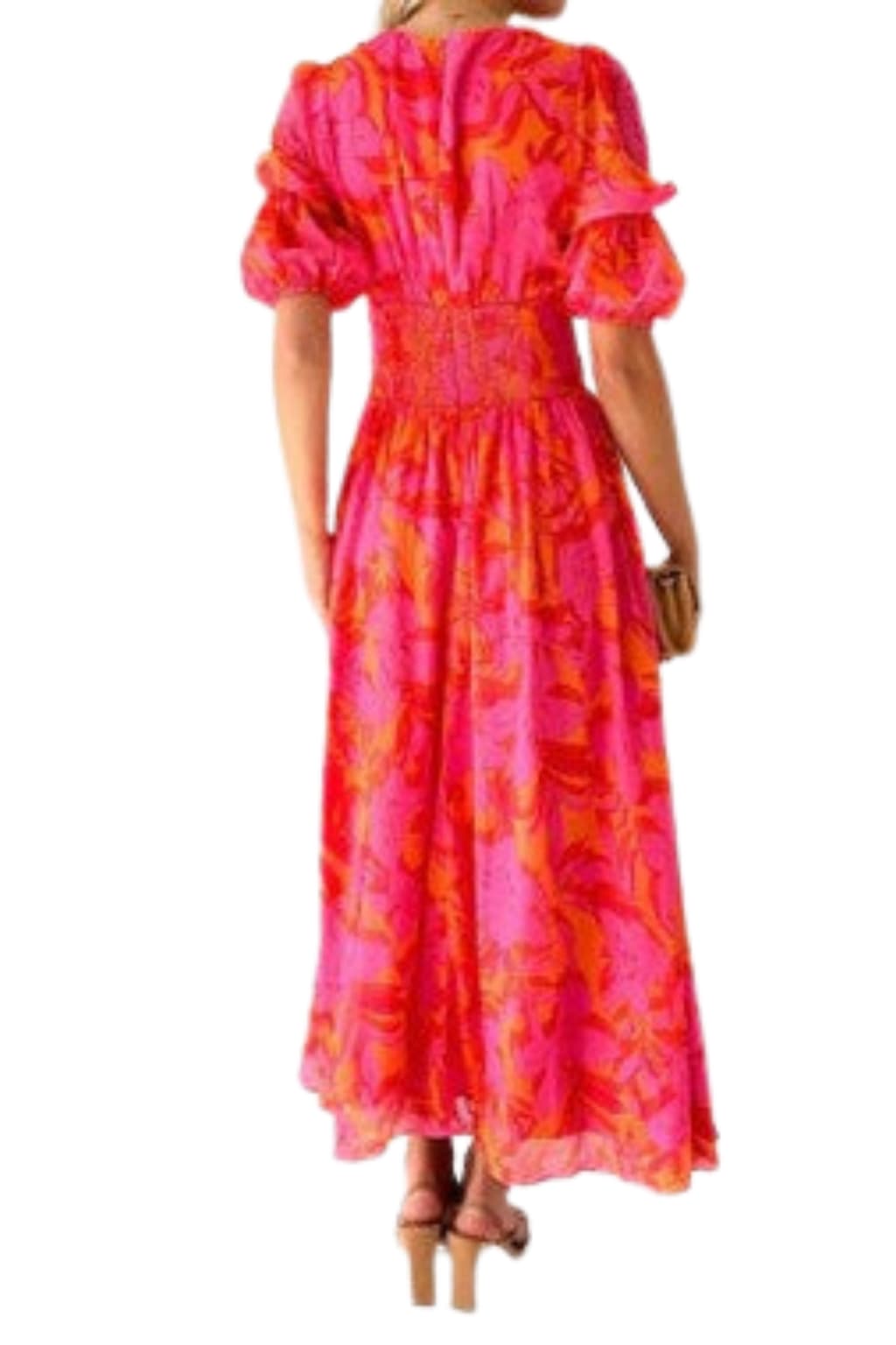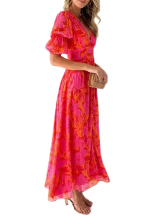 This full-length dress features a contoured upper section and a wide, floor-length hem. Highlighted by a floral print and defined waist, it combines a shaped fit with extended length suitable for warm-weather use. The design includes short puff sleeves and a deep V-neckline for visual detail and functional wear.- Deep V-neckline: A shaped neckline positioned to balance coverage and ventilation.