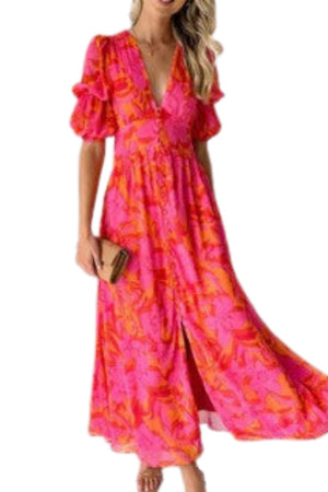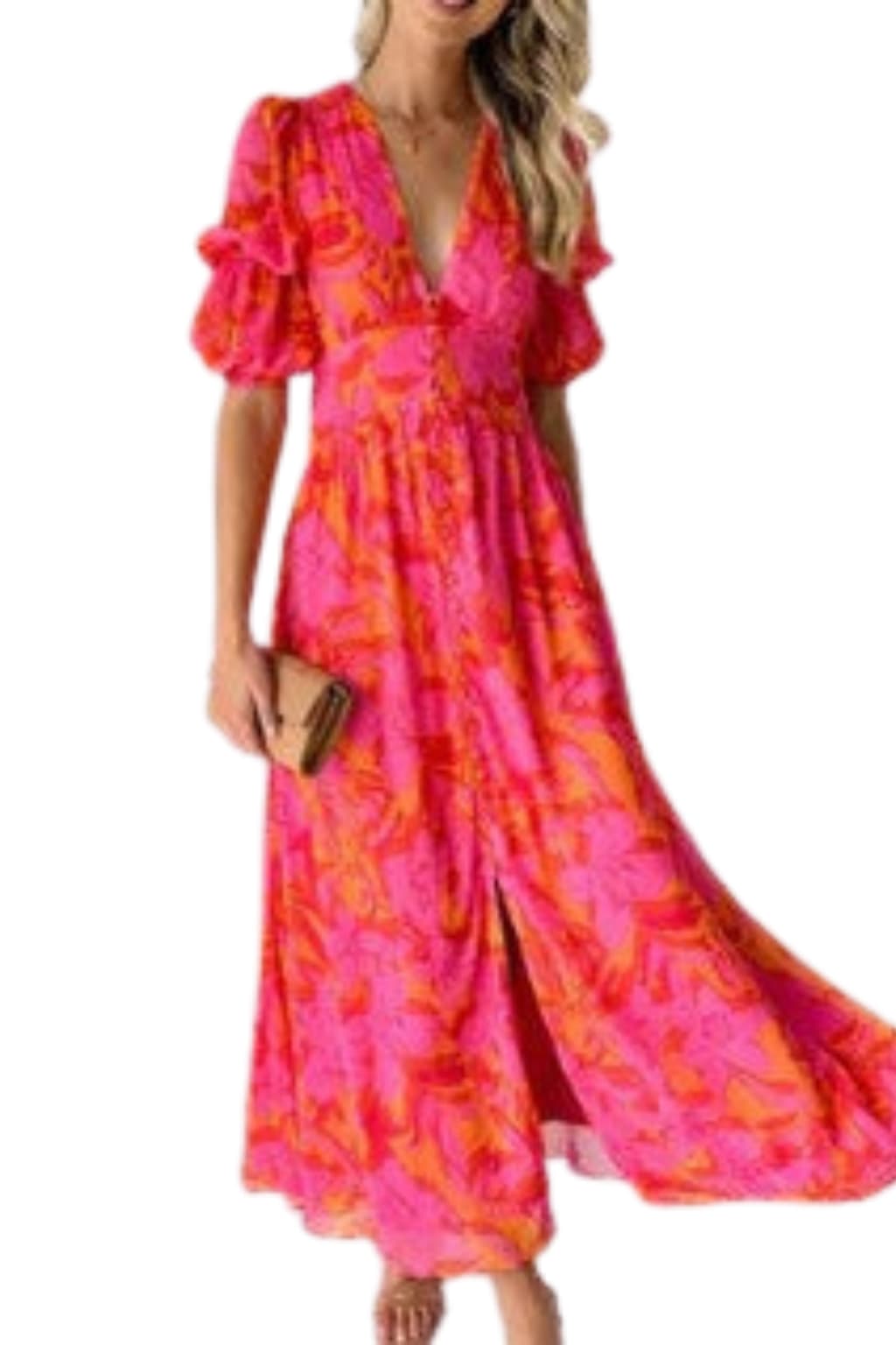 Women’s Floral Maxi Dress V-Neck Puff Sleeve Summer