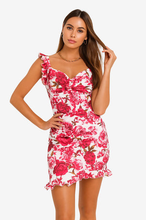 This women’s mini dress presents a close-to-body shape with layered ruffle accents and a floral surface design. Made for those who prefer defined construction with ease of movement, the dress combines smooth textures with a form-following outline. Suitable for event-based settings, it includes elements that support adaptable wear.- Sweetheart neckline with gathered detail: Curved neckline with light ruching provides visual shape at the upper section while maintaining hold.