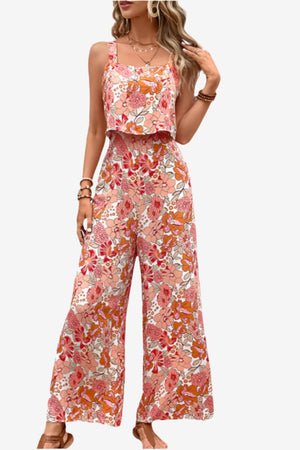 This set includes a sleeveless top and wide-leg pants featuring a matching floral motif. Designed with structured elements and adjustable features, it provides a loose silhouette for warm-weather settings. The pattern and fit are suited for casual daytime wear or outdoor gatherings.- Adjustable shoulder straps: The top includes narrow straps with length adjustment to support individualized placement.