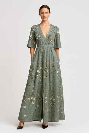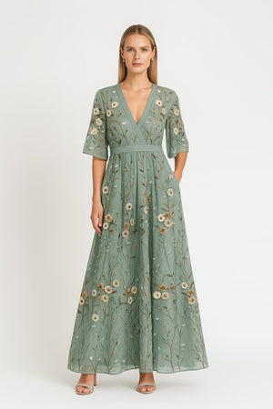 This women’s maxi dress features a light blue floral-embroidered pattern with an A-line silhouette and V-neckline. Made from a lightweight, sheer fabric, it is suitable for warm weather and various occasions.- A-Line Fit: Offers a flowing, non-restrictive silhouette.