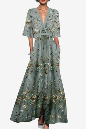 Women's Floral V-Neck Maxi Dress A-Line Fit Light Blue