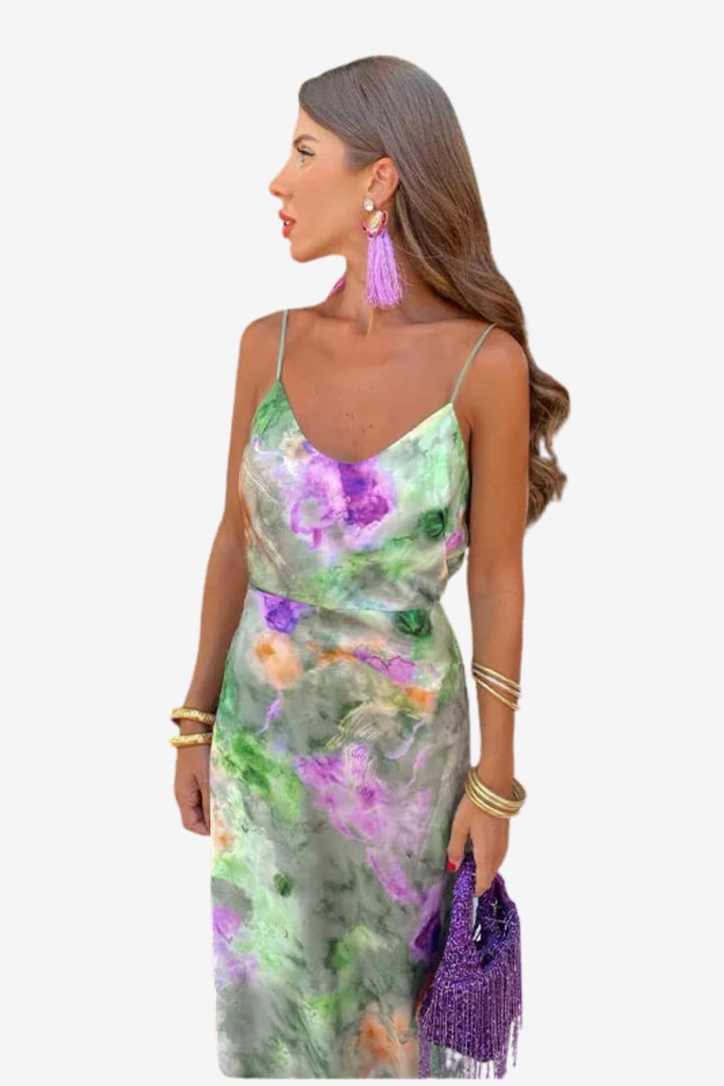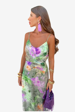 - Watercolor-style print: Rendered in layered tones of green, purple, orange, and white for varied visual composition across the surface.