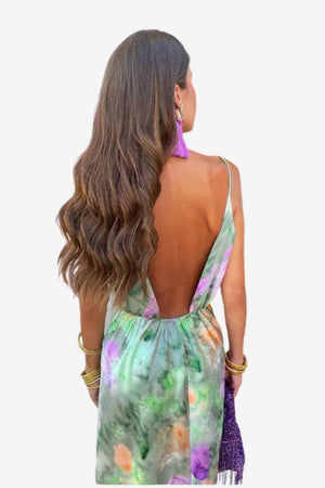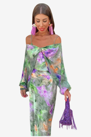 This long-sleeve maxi dress features extended length and soft shaping, designed for formal and semi-formal settings. With an open-back cut, fluid lines, and a print inspired by watercolor compositions, the piece suits those looking for a visually dynamic garment with a relaxed structure. Its adaptable form and smooth surface texture support day-to-evening use in different environments.- Relaxed long sleeves: Constructed with a loose fit through the arms, allowing for ease of movement while maintaining full-length coverage.