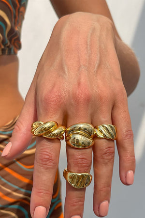 Women's Gold Alloy Twisted Chunky Ring Set includes three pieces for daily styling. Made from lightweight alloy, these rings feature varied textures and shapes, suitable for women seeking versatile accessories to complement casual outfits.- Adjustable Sizing: Alloy construction adjusts to fit most finger sizes.