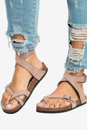 These women's gold strap sandals combine simple shapes with visible structure, intended for warm-weather use. Featuring a flat base and an adjustable ankle fastening, they are designed to enable movement while maintaining a defined outline. Crossed straps and a toe-ring component contribute to a stable format suitable for both relaxed and more structured outfits.- Flat sole structure: Designed for consistent surface contact underfoot with no added elevation, suitable for varied walking environments.