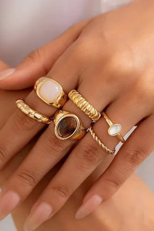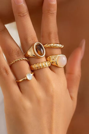 - Middle Finger Ring: Gold-tone bezel with smooth brown stone.