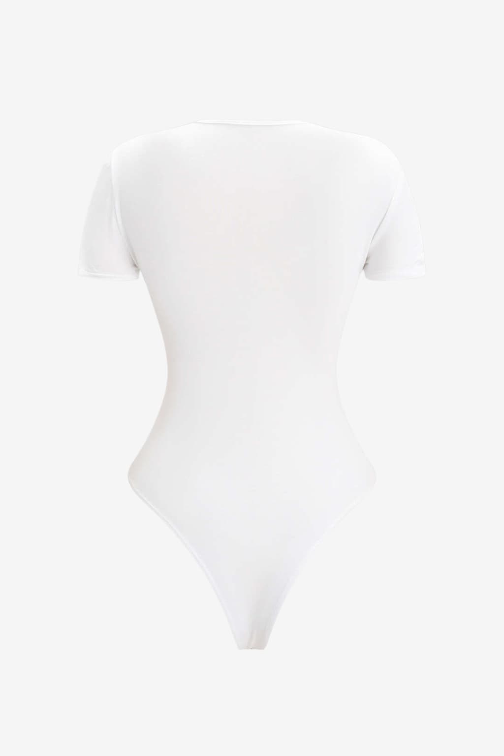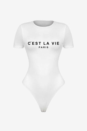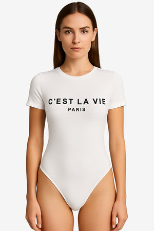 This short-sleeved bodysuit features a rounded neckline and printed chest text in a streamlined format. Designed with a close-fitting shape, the garment offers smooth layering options and neutral styling. The structure is suited for pairing with high-waisted bottoms in everyday settings.- Round neckline: Creates a symmetrical frame compatible with various outer layers.