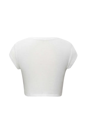 This women’s short sleeve crop top features a narrow-cut profile and graphic front print, intended for casual use in a contemporary format. The round neckline and cropped length are designed for a defined fit that aligns with daily wear. The fabric blend has a smooth surface and limited stretch for a close-to-body feel.- Short cropped fit: Sits above the waist to coordinate with high-rise bottoms for a proportional appearance.