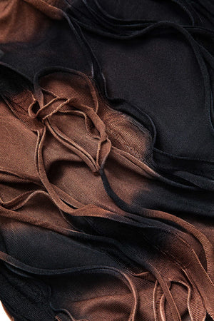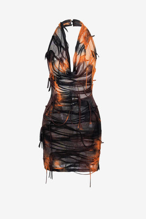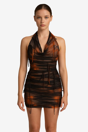 The Women's Halter Backless Tie-Dye Mini Dress features a fitted, semi-sheer design with a brown and orange tie-dye pattern. Its lightweight, form-fitting fabric and halter neckline suit various occasions for women seeking a distinctive garment.- Fitted Silhouette: Bodycon shape contours the body for a tailored fit.