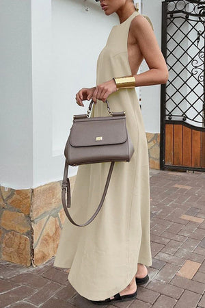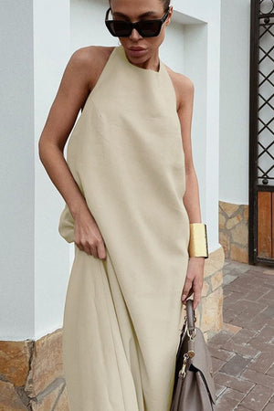 The Women’s Halter Neck Sleeveless Maxi Dress by Elegance-Urban is designed for comfort and style during warm weather. Made from a breathable cotton-linen blend, this loose-fitting maxi dress features a halter neckline and a flowy silhouette, offering a minimalist and versatile look. Its neutral beige tone complements a variety of occasions, from casual outings to formal gatherings.- High Halter Neckline: Elegant design that highlights the shoulders and neckline.Pairs well with statement earrings or a bold necklace.