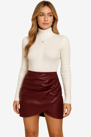 This high-waisted mini skirt features an overlapping front slit with ruched texture and structured shaping. Made from smooth faux leather with a subtle surface shine, the design offers a defined silhouette and consistent form. Suitable for varied wardrobe pairings, the piece presents a modern profile with clean construction.- High-rise fit: Designed to sit above the waist and provide an upper-structured outline.