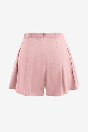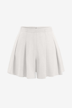 These high-waisted pleated shorts feature a defined upper fit combined with a flared lower profile. Designed for warm-weather use, they offer a tailored shape with pleats that introduce volume and visual continuity. The design combines structured function with soft-edge details suitable for varied settings.- High-rise waist: Includes a fitted upper portion that supports a defined silhouette around the waist.