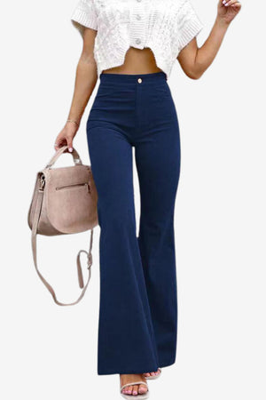 These Women's High-Waisted Flared Trousers feature a fitted silhouette through the hips and thighs, flaring from the knee. Crafted from textured material with a smooth surface, they provide a structured look for women seeking adaptable pants for various settings or occasions.- Tailored Fit: High-waisted, snug through hips and thighs, flares at knee.
