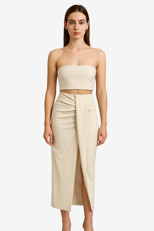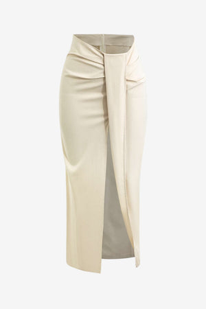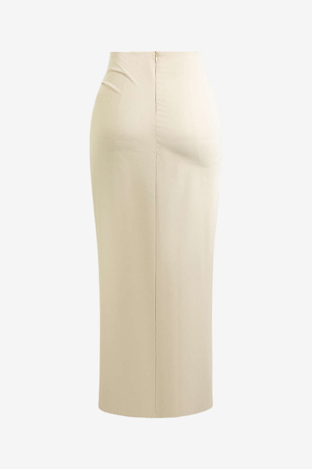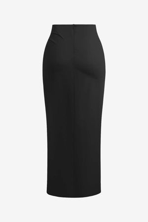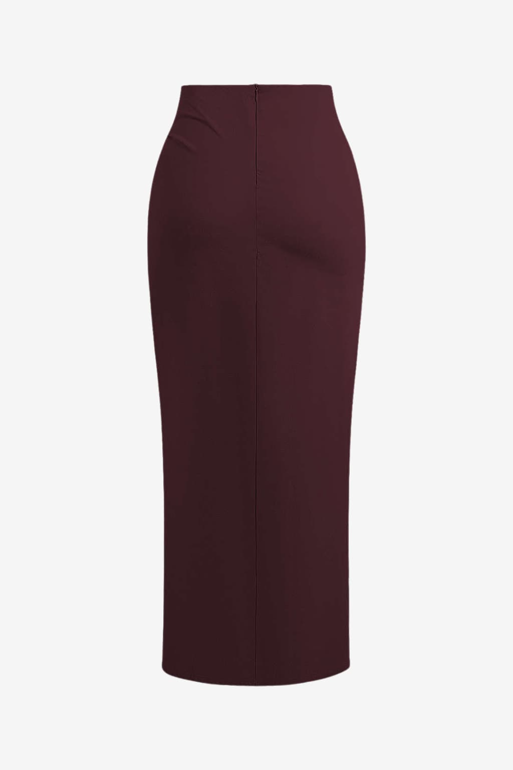 The Women's High-Waisted Twist-Front Midi Skirt is a fitted bottom designed for formal and semi-formal settings. Its non-sheer, low-stretch fabric offers a structured fit, suitable for women seeking a tailored silhouette with a front twist and slit for added detail.- Fitted Silhouette: High-waisted with 28.0" waist, 38.2" hips in size S.